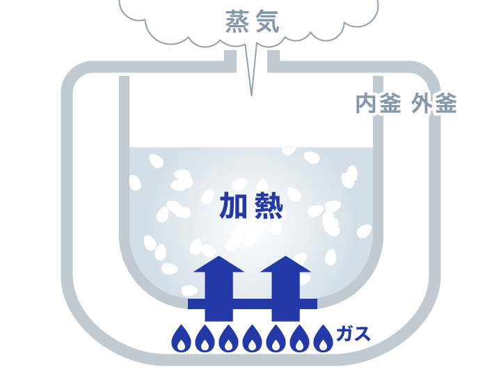 底面のヒーターから内釜に熱を伝えお米を炊き上げるタイプ。